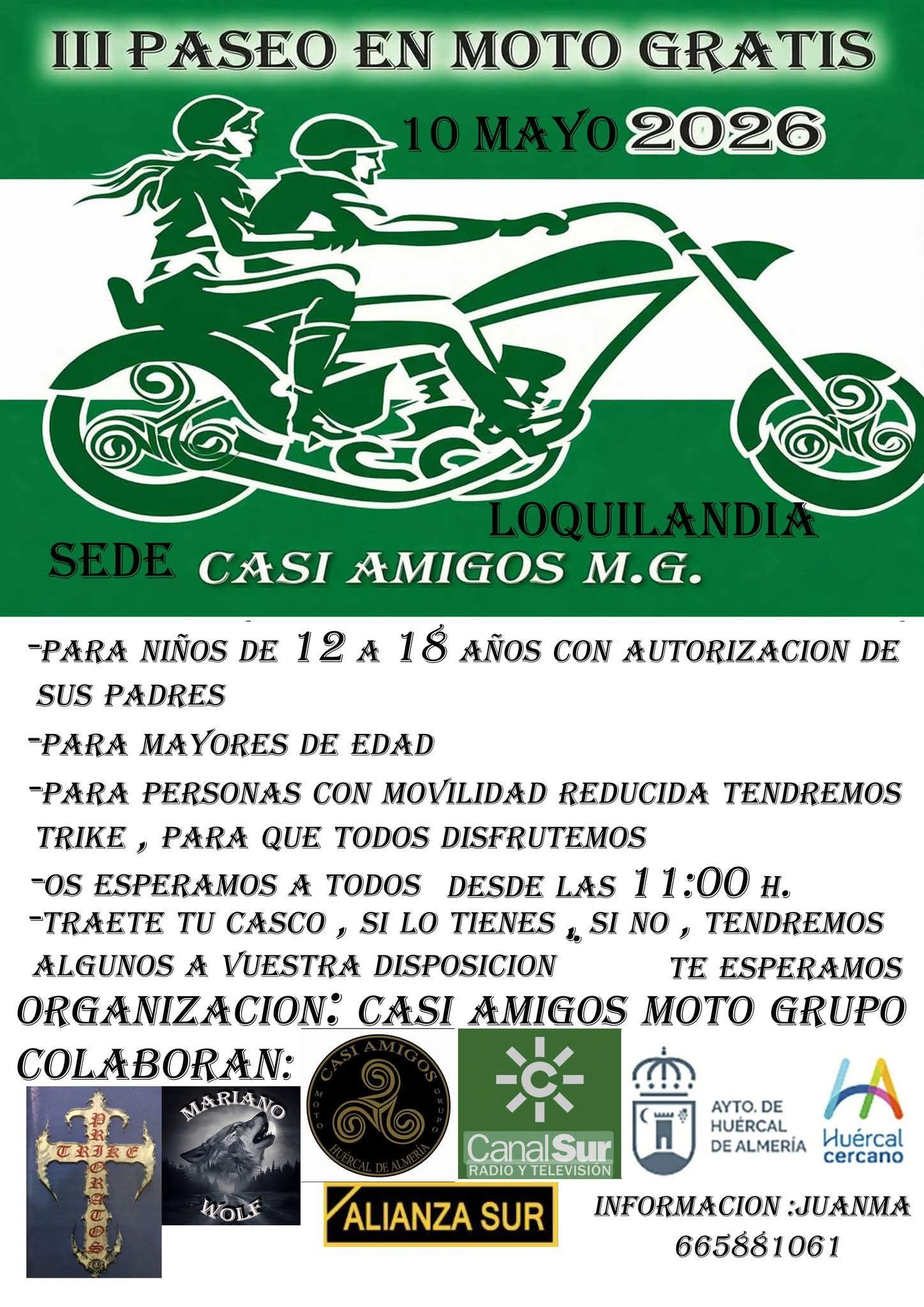 Domingo 10 de Mayo, Sede Casi Amigos M.G en Parque Loquilandia Huercal de Almeria. Desde las 11:00 h Para niños de 12 a 18 años con autorizacion de sus padres. Mayores de edad, Persona con movilidad reducida